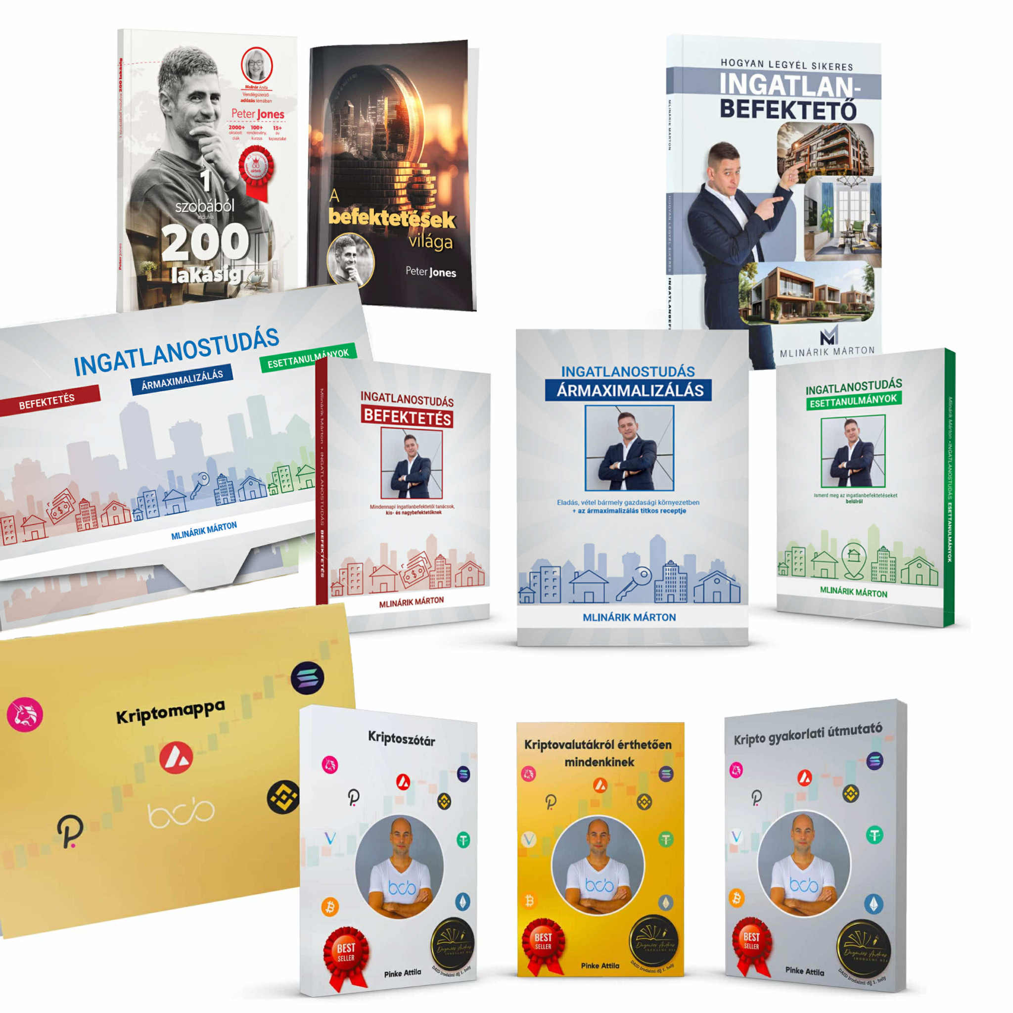 Ármaximalizálás + Befektetés + Esettanulmányok + Ajándékok + 1 szobából 200 lakás + befektetések világa + Ingatlanbefektetés + Kriptos Könyvcsomag